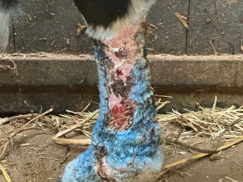 Na twee weken was alles wat wit was, ernstig verbrand, en bevestigde de veearts dat het ging om fotosensibilisatie (een vergiftiging van de lever). Tussen de foto's zit een maand verschil.